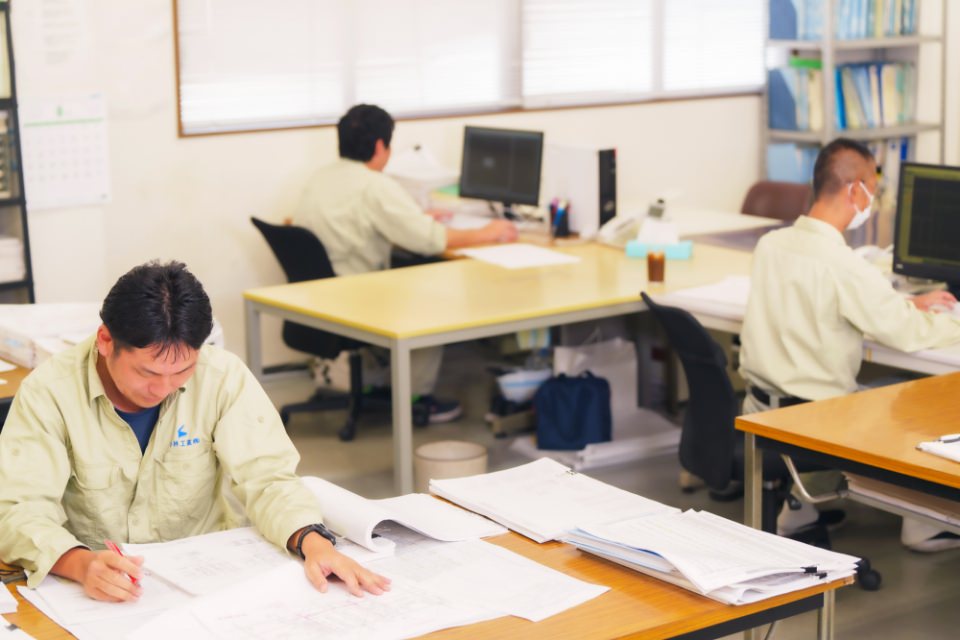 現代では精度の高いNCデータにて加工を行うのが主流で、事務所でデータ入力したものを加工機へ入力し孔あけや切断、開先や摩擦面処理などの加工を施します。