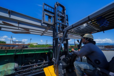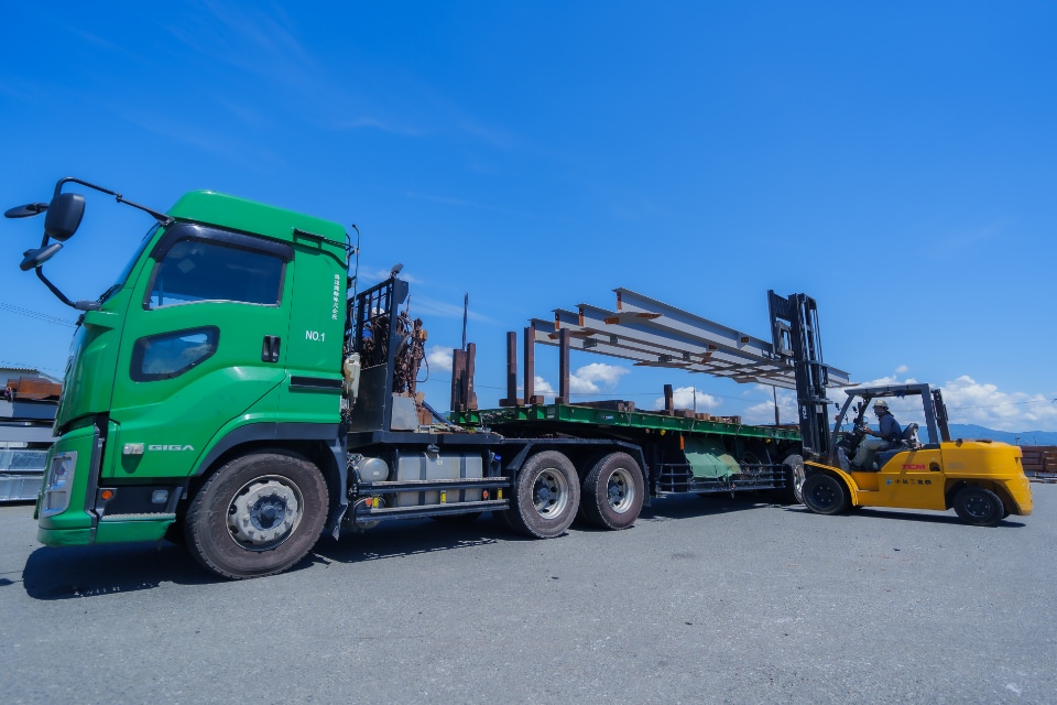 工場で錆止め塗装を施し、建方工区順に仕分けを行います。出荷日が近づいてくると出荷リストの製品が全て揃っているか検品を行い、現場へ向かう大型トラックに積み込みます。